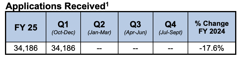 根据数据,2025财年第一季度,美国劳工部一共收到了34,186份美国职业移民绿卡PERM申请,这比上一财年同期减少了17.6%