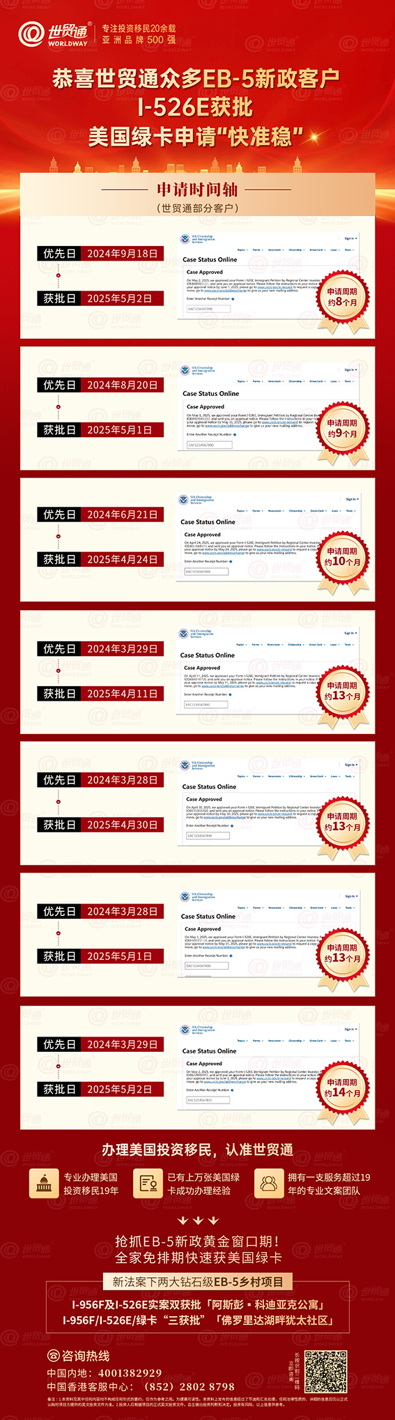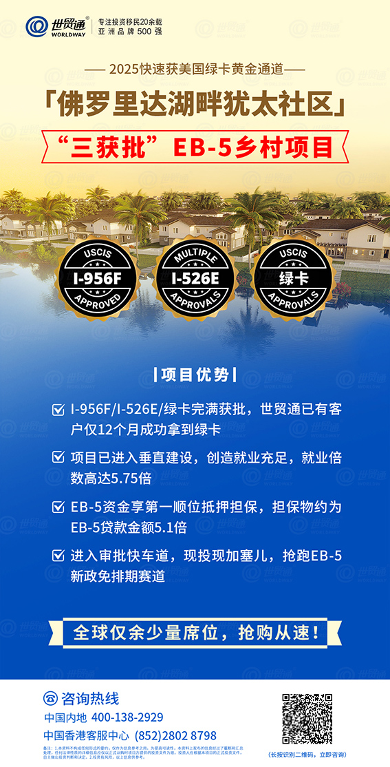 当前,市面上热销的两大精品EB-5项目——I-956F/I-526E/绿卡三获批的「佛罗里达湖畔犹太社区」已获得I-956FI-526E实案双获批「阿斯彭▪科迪亚克公寓」都是经过世贸通集团层层筛选、严格把关后的优质 EB-5乡村项目,无疑是您快速移民美国的上佳之选。