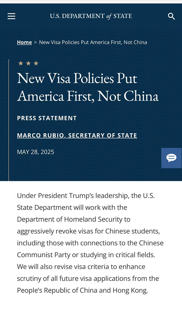 • 将“狠狠撤销”(aggressively revoking)中国学生签证,优先针对那些被认定与中国政府有关联者,或就读“关键领域”(critical fields)的学生。