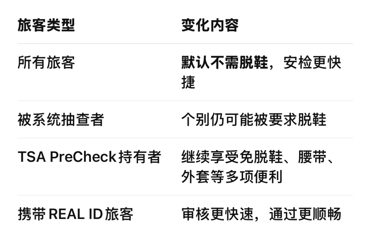 美国机场安检简化,正式告别“脱鞋时代”!美国国土安全部(DHS)官宣:即日起,旅客通过TSA安检将不再被强制要求脱鞋!这是2006年以来最重大的一次安检流程改革。