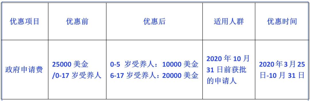 近年来,安提瓜投资入籍项目接连释放利好消息,护照的含金量不断攀升。在2020年3月25日-10月31日期间,已获批的申请人办理增加受养子女时最高可享受1.5万美金/人的优惠,具体明细如下: