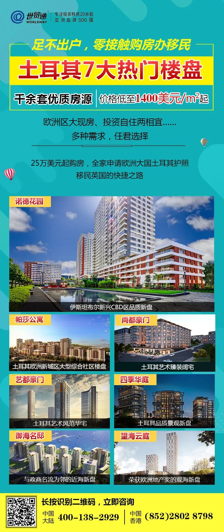 亚洲品牌500强的世贸通集团,作为较早推广欧洲买房移民项目的移民机构,以前瞻性眼光,携手土耳其实力开发商向广大投资者隆重介绍多个近海公寓、花园大宅等土耳其优质房产项目,如诺德花园、帕莎公寓、尚都豪门、艺都豪门、四季华庭、御海名邸、望海云庭,是目前市场上较受欢迎的项目!7大热门楼盘,千余套优质房源,价格低至每平米1400美元起,欧洲区大现房,投资自住两相宜……多种需求,任君选择!