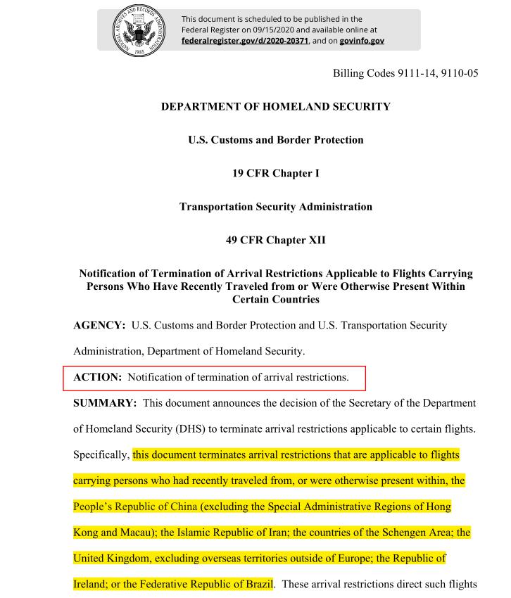 近日,美国国土安全部,海关和边境保护局以及运输安全管理局发布通知,将自美东时间9月14号起解除对中国(不包括中国澳门和中国香港)等一些国家航班到达的限制。而该通知,近日被误读为“美国取消旅华禁令,9月14日后可以直飞美国”在国内广泛传播。真实情况如何,世贸通为您简要梳理。
