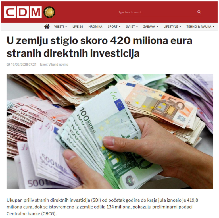 黑山中央银行(CBCG)的数据显示,从2020年初至7月底,流入黑山的外国直接投资总额为4.198亿欧元,7月份,外国直接投资的净流入达到2.858亿欧元,较去年同期增长18.4%!