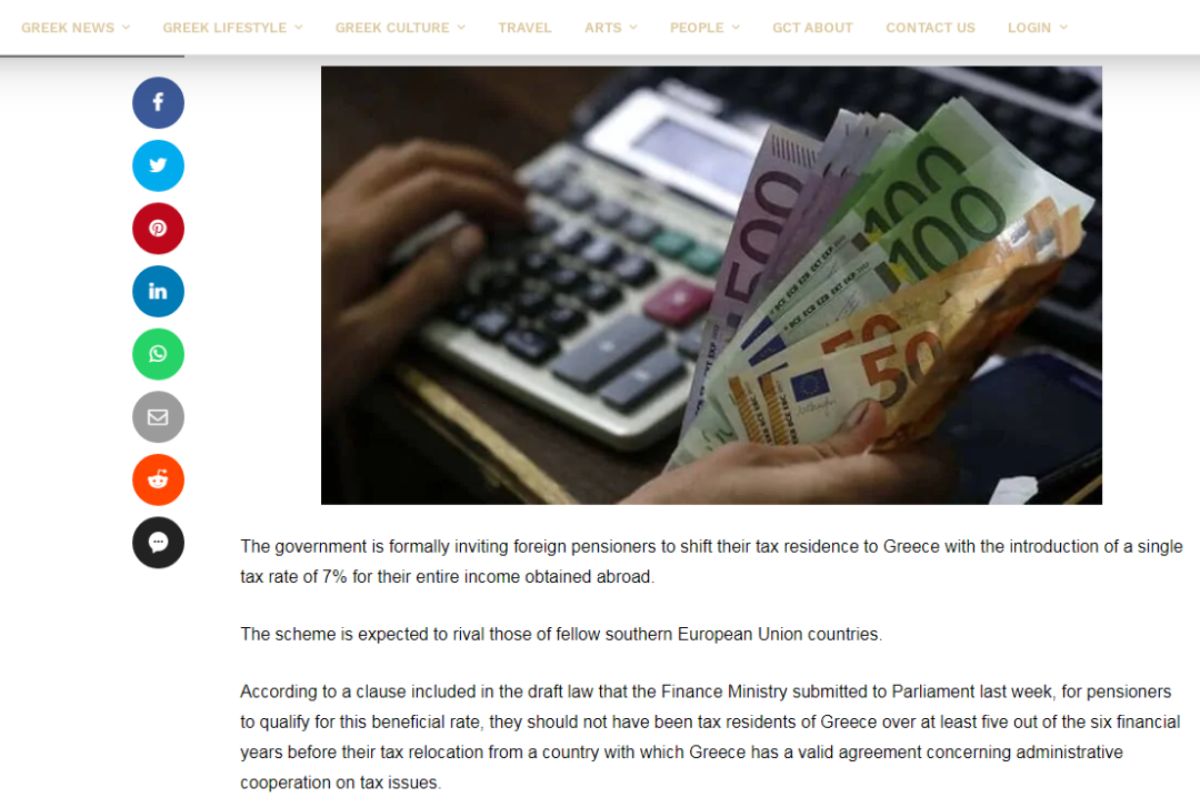 据希腊《每日报》报道,近期,希腊政府正式发布关于申请希腊税务居民资格详细要求的公告,提出三项纳税优惠,向海外养老金领取者发出邀请,呼吁他们前往希腊安度晚年,并表示希腊政府已出台更多优惠政策。