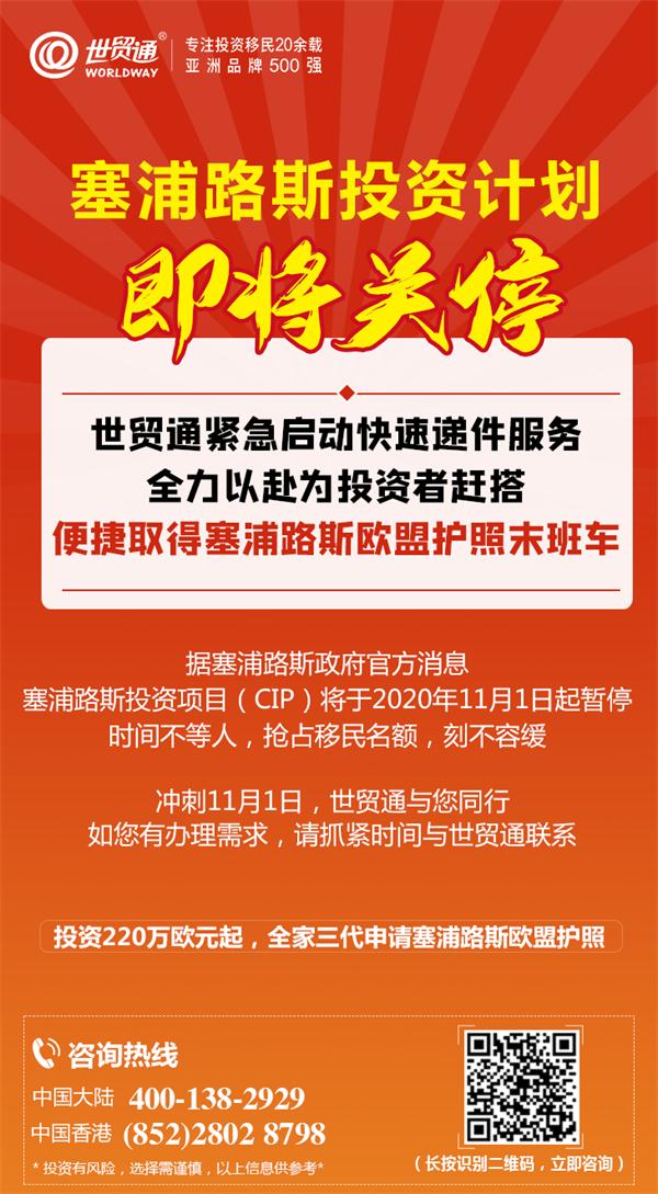 作为投资移民二十余载、亚洲品牌500强世贸通集团,已紧急快速备案及递件服务。目前,世贸通集团的项目团队、文案团队、客服团队以及驻海外专人团队等,多方联动,分工明确又密切配合,全力以赴,与时间赛跑,夜以继日、加班加点地帮助投资人赶在11月1日前完成相关申请递件程序。建议对塞浦路斯欧盟身份有意向的投资人尽快联系世贸通,把握住关停前难得的窗口期机会!
