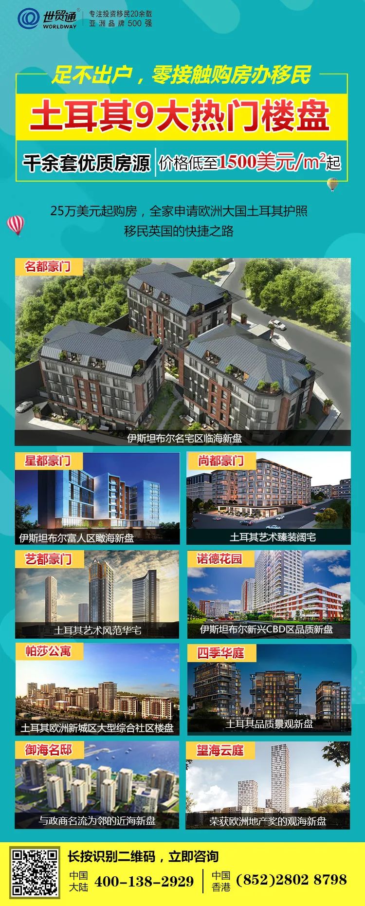 亚洲品牌500强的世贸通集团,作为较早推广欧洲买房移民项目的移民机构,以前瞻性眼光,携手土耳其实力开发商向广大投资者隆重介绍多个近海公寓、花园大宅等土耳其优质房产项目,如名都豪门、星都豪门、尚都豪门、艺都豪门、帕莎公寓、诺德花园、四季华庭、御海名邸、望海云庭,是目前市场上较受欢迎的项目!9大热门楼盘,千余套优质房源,价格低至每平米1500美元起,多种需求,任君选择!25万美金起购房,全家申请欧洲大国土耳其护照,开启移民英国的快捷之路!