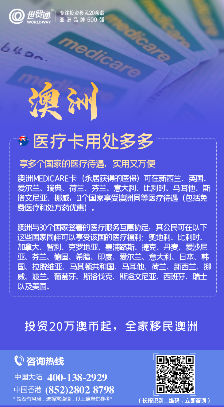 澳洲全民医保卡即Medicare卡(永居获得的医保)堪称“全世界最好用的医保卡”。可在新西兰、英国、爱尔兰、瑞典、荷兰、芬兰、意大利、比利时、马耳他、斯洛文尼亚、挪威,11个国家享受澳洲同等医疗待遇(包括免费医疗和处方药优惠)。