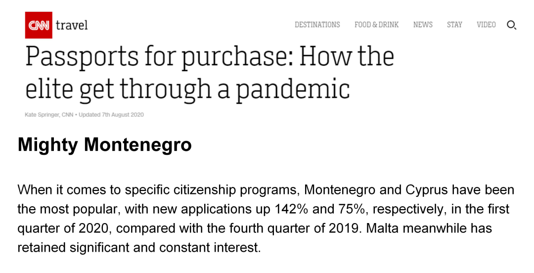 近日,CNN刊文报道称,在特定的公民投资计划方面,黑山和塞浦路斯是较受欢迎的国家!与2019年第四季度相比,黑山投资入籍计划和塞浦路斯投资计划在2020年第一季度,即全球疫情期间的申请量分别激增142%和75%,表现亮眼!