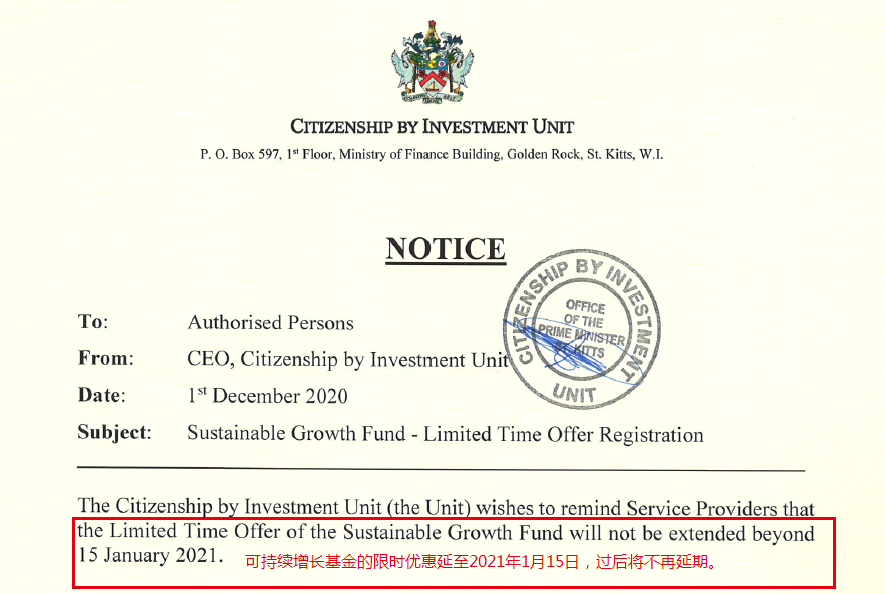 重大好消息!近期,圣基茨投资移民利好不断!继推出兄弟姐妹可随同主申请人一同移民之后,圣基茨和尼维斯移民局近日发布公告:延长通过向可持续增长基金捐献方式移民圣基茨和尼维斯的降价优惠截止日期至2021年1月15日。移民局强调,在2021年1月15日优惠到期后将不会再延期。