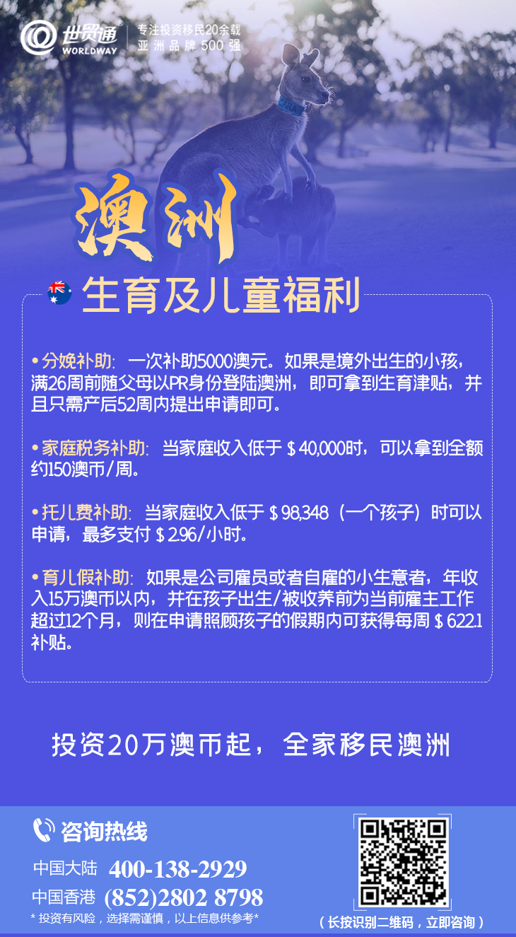 这是一笔一次5,000澳元的补助。如果是国内出生的小孩,在满26周前随父母以PR身份登陆澳洲,那么生育津贴是可以拿到的,并且只需产后52周内,提出申请即可。