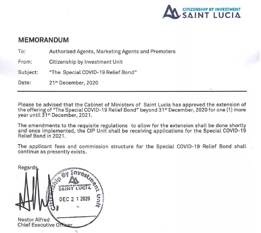 圣卢西亚移民局长Nestor Alfred表示:“允许延期的必要法规修正案将很快完成。一旦实施,移民局2021年将继续接收抗疫国债选项下的申请案。”