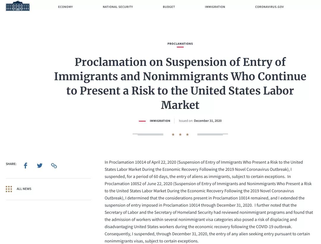近日,美国总统川普宣布:将原本于2020年12月31日到期的“暂停移民入境美国限制令”延长三个月,至2021年3月31日