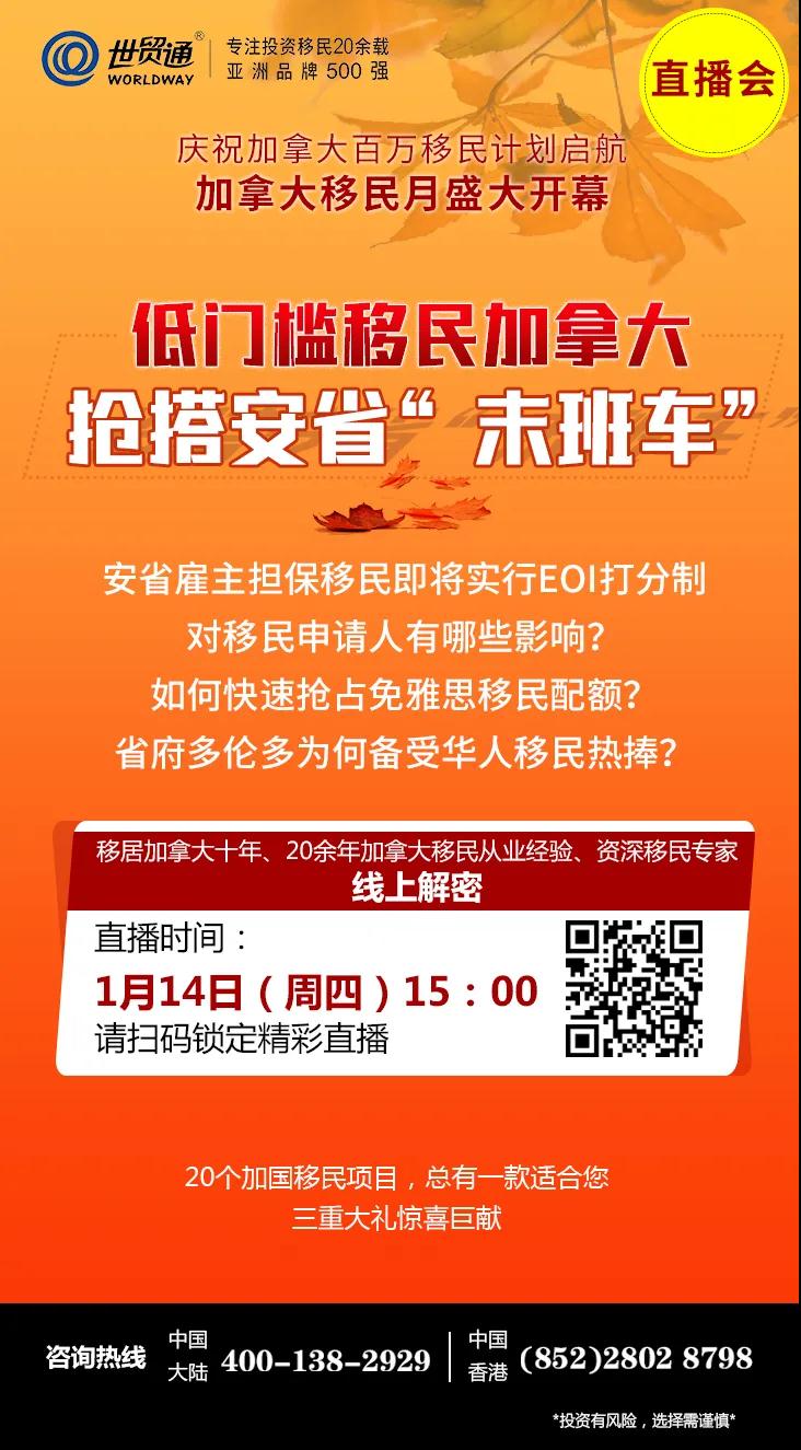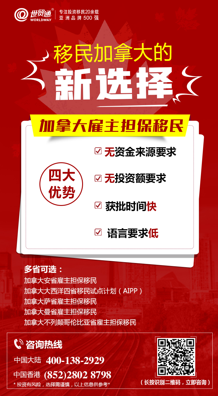 目前,正值加拿大移民月期间,限时大优惠正火爆进行中,三重大礼惊喜巨献,天天红包大派送,《百万移民计划白皮书》、《速获枫叶卡Q&A手册》免费领取,更多优惠,请咨询世贸通集团。