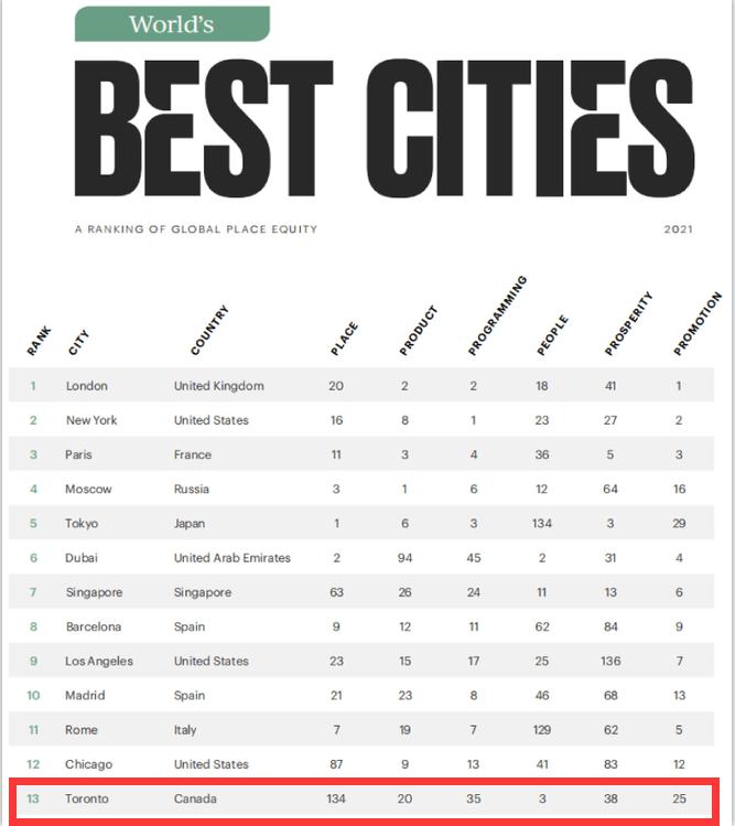 近日,国际咨询公司Resonance Consultancy发布了《2021年世界最佳城市报告》, 其中,加拿大多伦多创下历史新高,名列榜单第13位,成为全球最佳城市之一。
