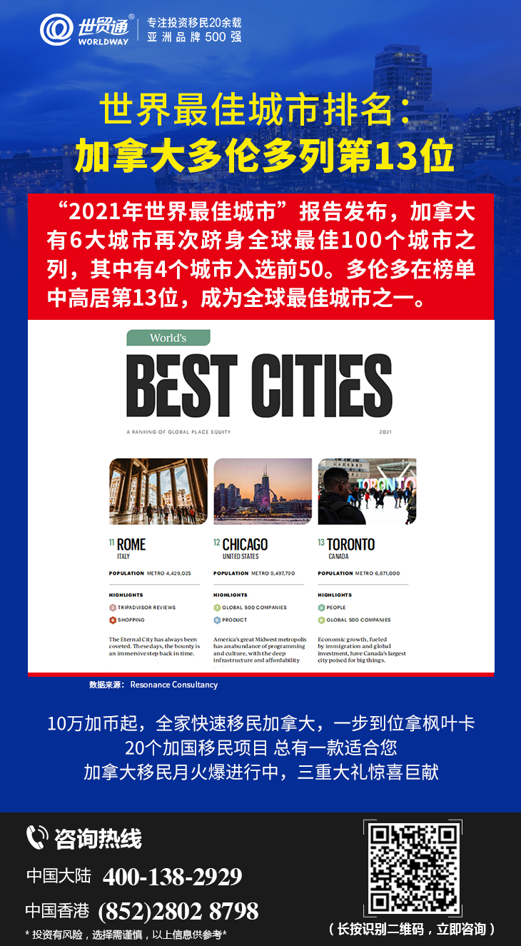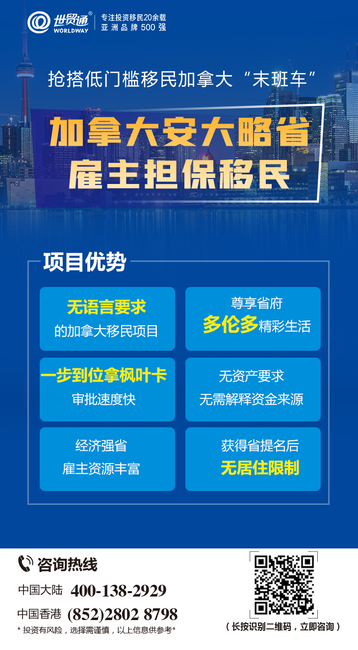 目前,正值加拿大移民月期间,限时大优惠火热进行中,2021年1月三重大礼惊喜巨献,天天红包大派送;《百万移民计划白皮书》《速获枫叶卡Q&A手册》免费领取,更多优惠,请咨询世贸通集团。服务热线:中国大陆:400-138-2929 中国香港:(852) 2802 8798。