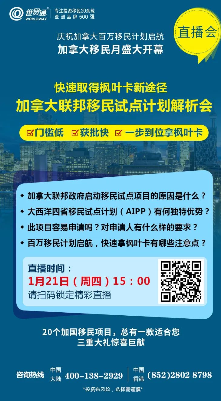 2021年1月,加拿大移民月期间,世贸通将举办多场加拿大移民线上直播活动,以及涵盖加拿大教育、生活福利等一系列丰富多彩的线下活动!同时,为感谢新老客户一直以来对世贸通的支持与信赖,世贸通推出限时大优惠活动,三重大礼惊喜巨献,天天红包大派送,不容错过!更多详情,请咨询世贸通服务热线,中国大陆:400-138-2929 中国香港:(852)2802 8798