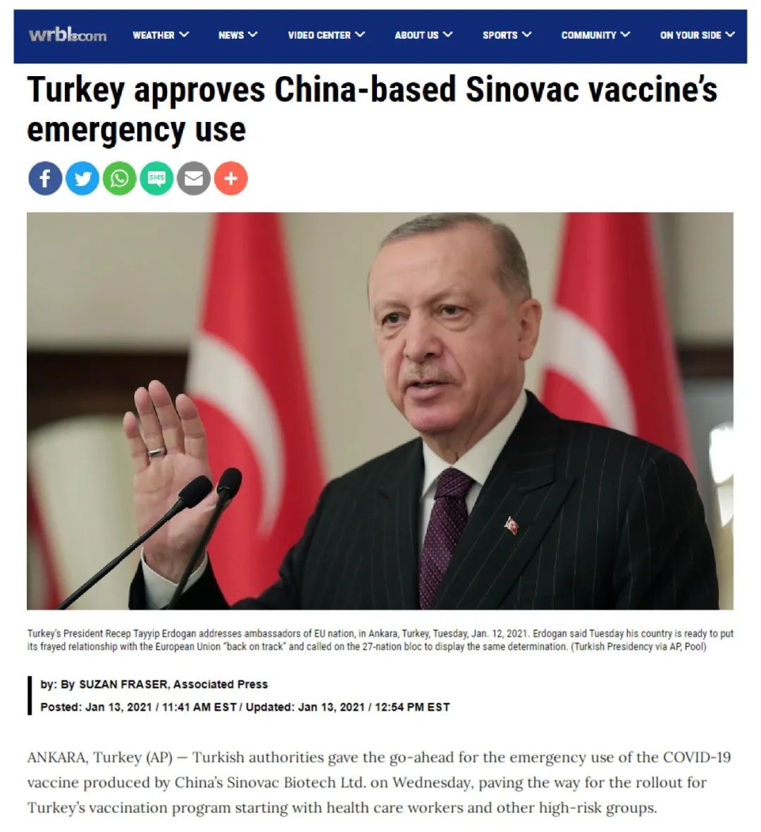 土耳其卫生部长在去年12月召开的新闻发布会上表示,从2020年9月14日起在土耳其开展的III期临床试验结果表明,中国科兴疫苗安全有效,试验数据显示,有效性达到91.25%。目前,土耳其总共购买了5000万剂的中国科兴疫苗,首批300万剂新冠疫苗已成功运抵首都安卡拉。此外,土耳其还订购了450万剂辉瑞疫苗,并可能在未来继续购买3000万剂该疫苗。