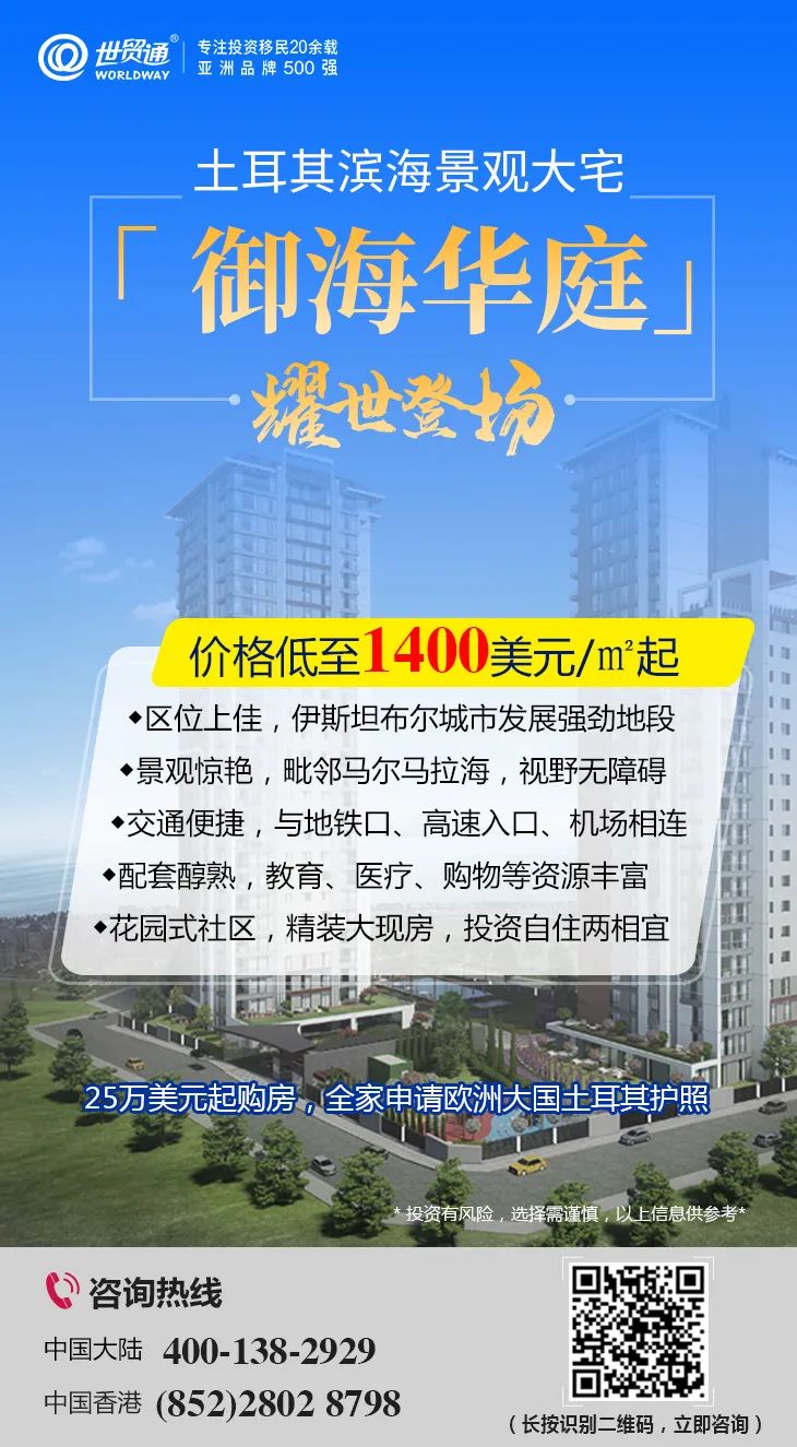 世贸通除了携手土耳其实力开发商向广大投资者介绍的土耳其御海华庭项目,还有四季华庭、御海名邸、望海云庭,亦是目前市场上较受欢迎的项目!精装大现房、投资自住两相宜……多种需求,任君选择!25万美金起购房,全家申请欧洲大国土耳其护照!