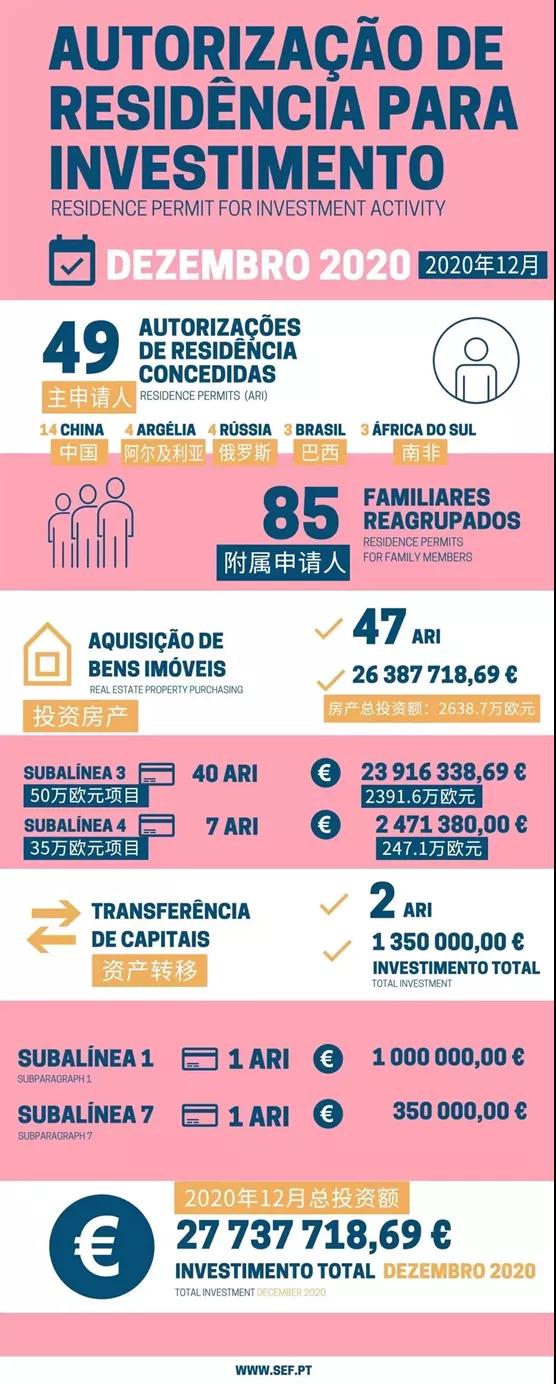 近日,葡萄牙移民局(SEF)公布了2020年12月黄金签证数据。根据数据显示,2020年12月,共有49位主申请人携85位附属申请人获批葡萄牙黄金签证,投资额达2773.77万欧元。