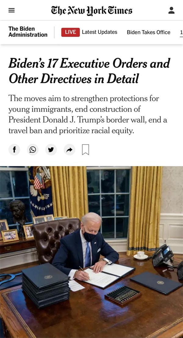 美国东部时间1月20日,美国当选总统、民主党人拜登在国会山宣誓就职,正式成为美国第46任总统。随后,拜登在白宫签署了内容涵盖疫情、经济、气候变化和种族不平、移民改革等等17项行政命令、备忘录和对各机构的指示。