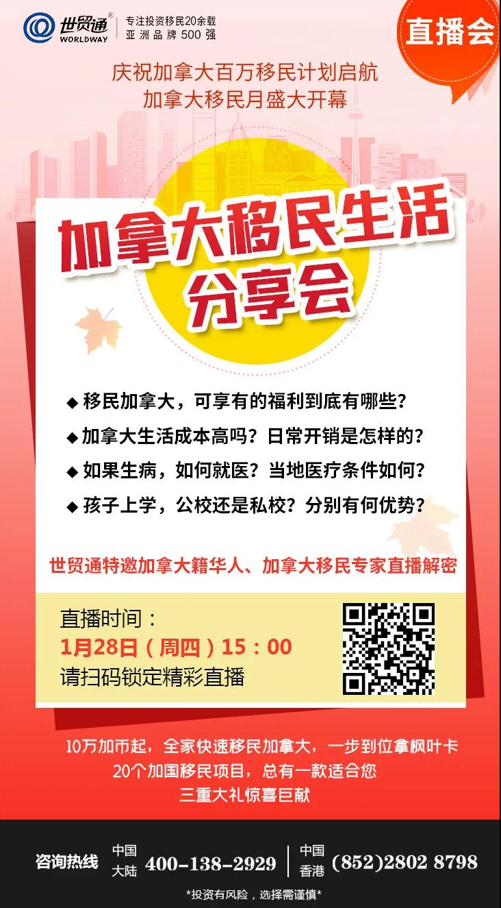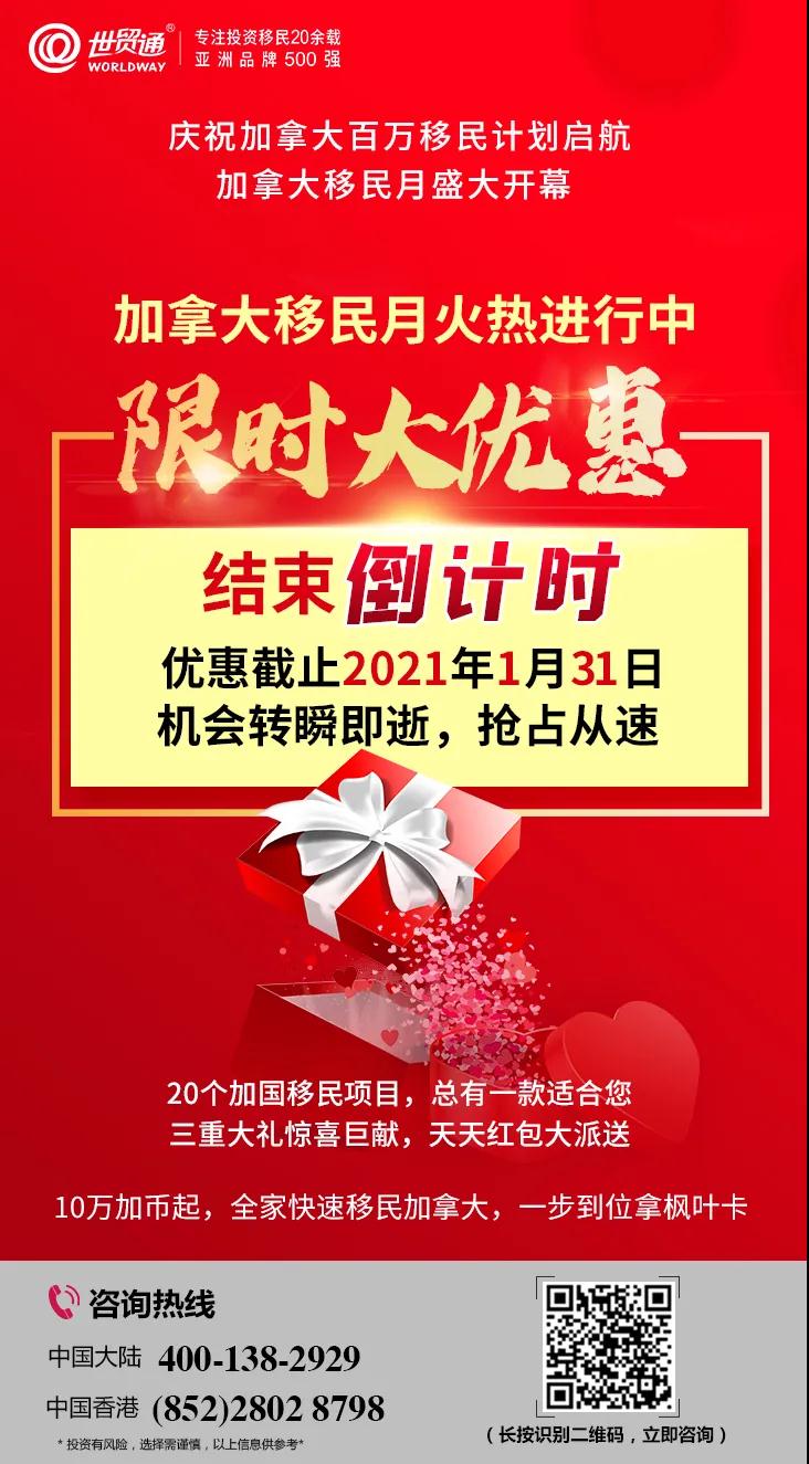 目前,正值加拿大移民月期间,限时大优惠火热进行中,2021年1月三重大礼惊喜巨献,天天红包大派送;《百万移民计划白皮书》《速获枫叶卡Q&A手册》免费领取,更多优惠,请咨询世贸通集团服务热线,中国大陆:400-138-2929 中国香港:(852)2802 8798。
