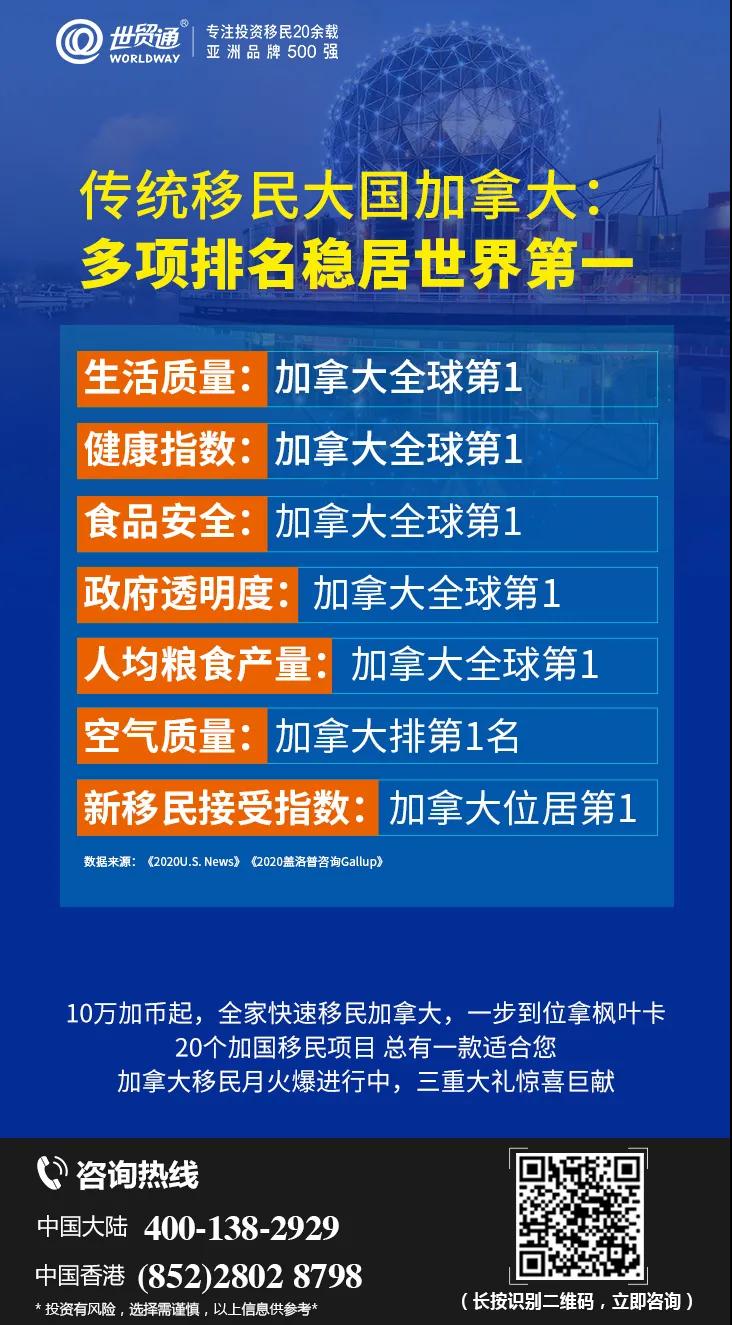 目前,正值加拿大移民月期间,限时大优惠火热进行中,2021年1月三重大礼惊喜巨献,天天红包大派送;《百万移民计划白皮书》《速获枫叶卡Q&A手册》免费领取,更多优惠,请咨询世贸通集团服务热线,中国大陆:400-138-2929 中国香港:(852)2802 8798。