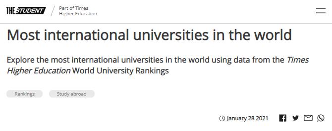 泰晤士高等教育认为,名校的本质其实是全球性机构,而不是单纯的属于某个国家。本次排名考量的指标和权重为:国际教职员工比例(25%)、国际学生比例(25%)、国际合著比例(25%)、国际声誉评分(25%)。