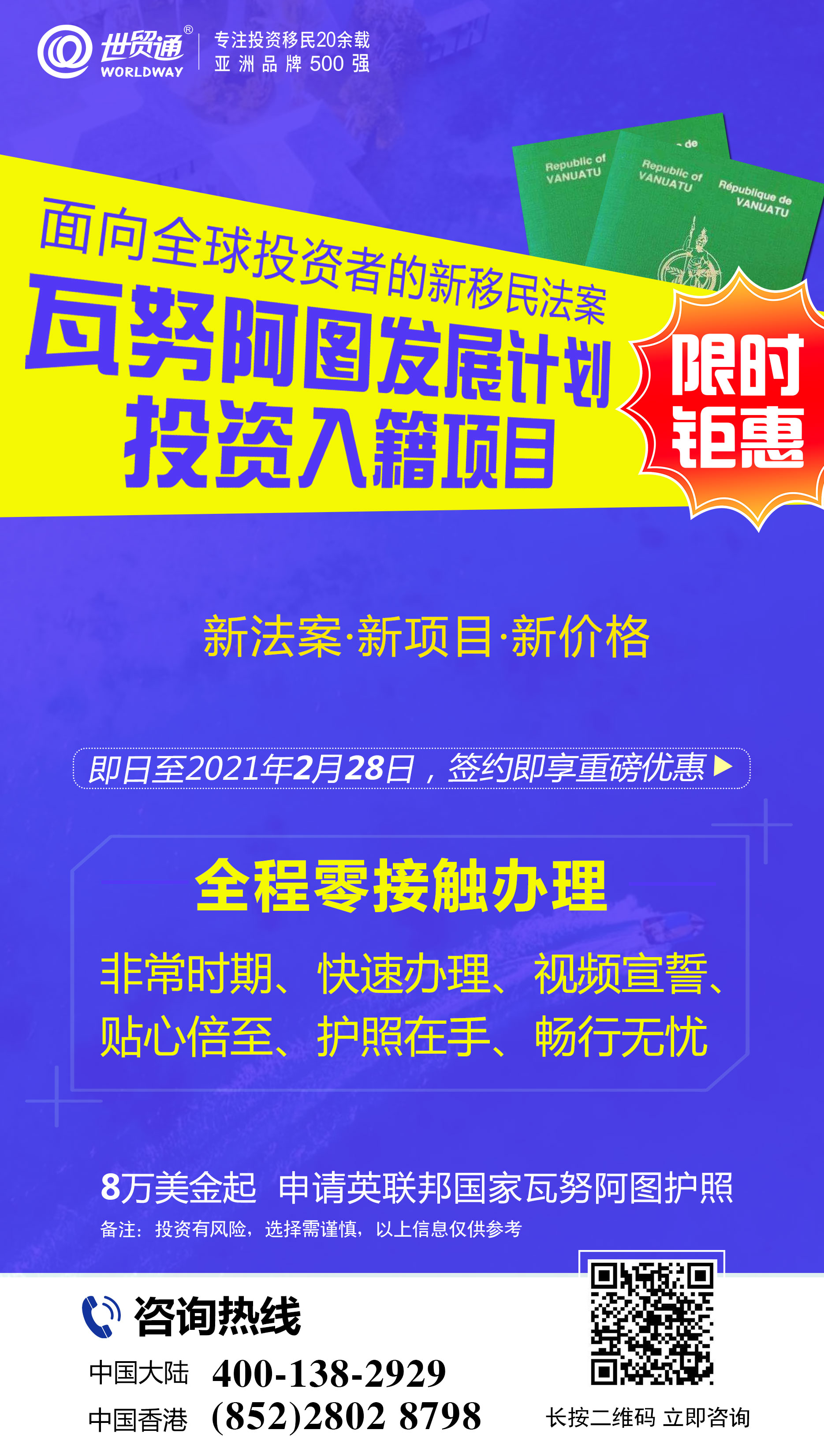 目前,世贸通全线大优惠,新春回馈活动火爆进行中,机会难得!投资世贸通热门项目,可享多重优惠!更多详情,请拨打世贸通服务热线,中国大陆:400-138-2929 中国香港:(852) 2802 8798 。