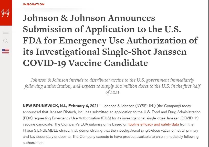 美国疫苗再传新消息!近日,强生公司(Johnson & Johnson, JNJ)表示已向美国食品药品管理局(Food and Drug Administration, 简称FDA)提交申请,寻求其实验性单剂Janssen新冠疫苗的紧急使用授权。如果申请获得批准,JNJ将是继辉瑞BioNTech和莫德纳Moderna开发的第三种Covid-19疫苗后,在美国获得紧急使用。