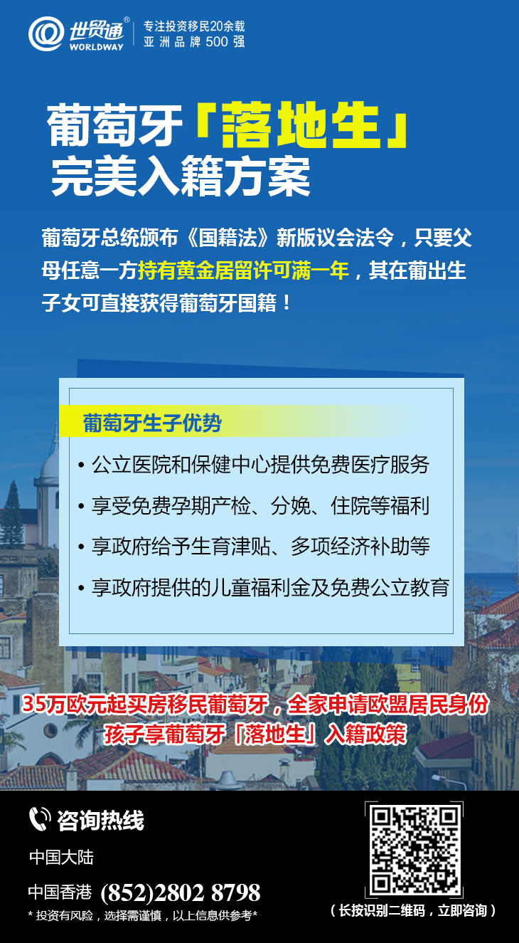 亚洲品牌500强世贸通集团,作为较早在中国推广葡萄牙黄金居留计划的移民机构,携手葡萄牙实力开发商,向广大投资者推介众多优质葡萄牙移民项目,如圣芭芭拉公寓及商铺、格雷卡2期公寓及商铺、大里斯本地区百亩庄园等,助力投资者赶搭里斯本、波尔图购房移民末班车!