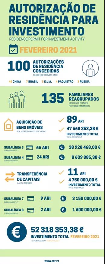 近日,据葡萄牙移民局(SEF)发布的黄金签证最新数据显示,2021年2月,共计100位主申请人和135位附属申请人获批葡萄牙黄金签证,获批主申请人数量与上月相比,几乎翻一番!2月份黄金签证的总投资额为5231.8万欧元,与上月相比,增幅高达58%。这一数字也创下了去年9月份以来的新高!