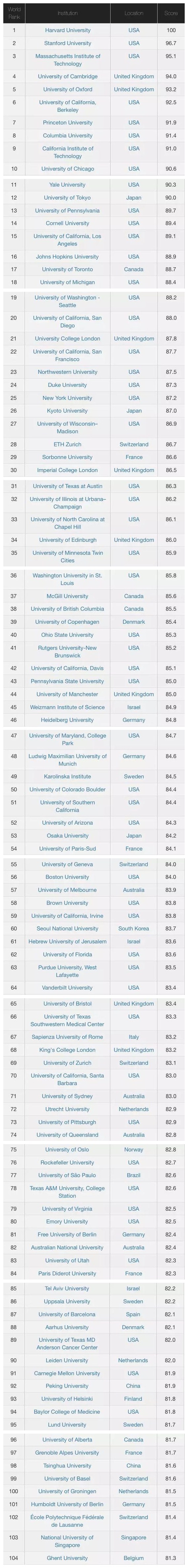 美国入围前十的大学分别是:哈佛大学;斯坦福大学;麻省理工大学;加州大学伯克利分校;普林斯顿大学;哥伦比亚大学;加州理工;芝加哥大学。美国共有51所大学入围前一百名高校。