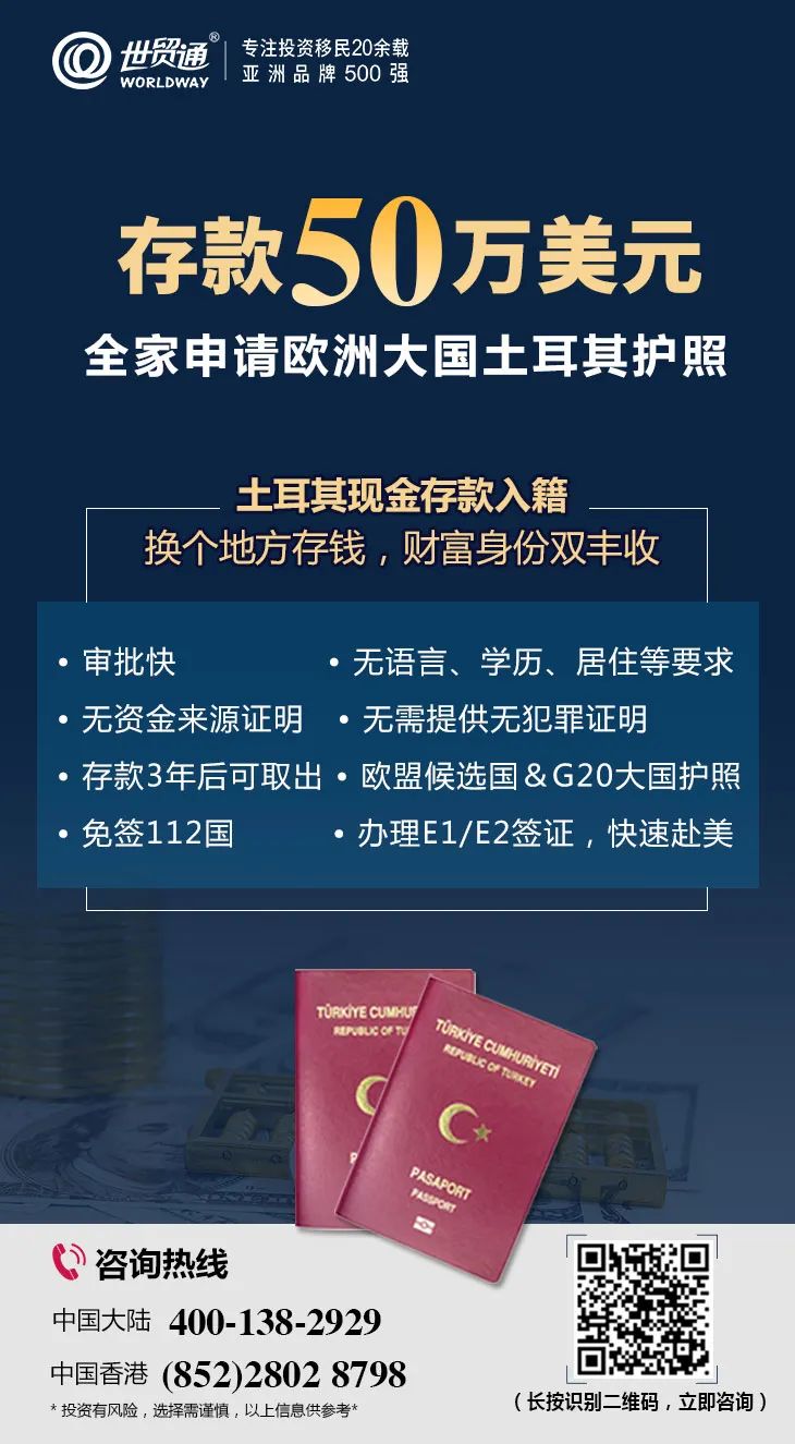 亚洲品牌500强、专注投资移民20余载的世贸通集团,作为欧洲投资移民积极推动者,与土耳其政府保持了良好的互动,是您办理土耳其护照的理想之选!更多详情,请拨打世贸通服务热线,中国大陆:400-138-2929 中国香港:(852) 2802 8798。