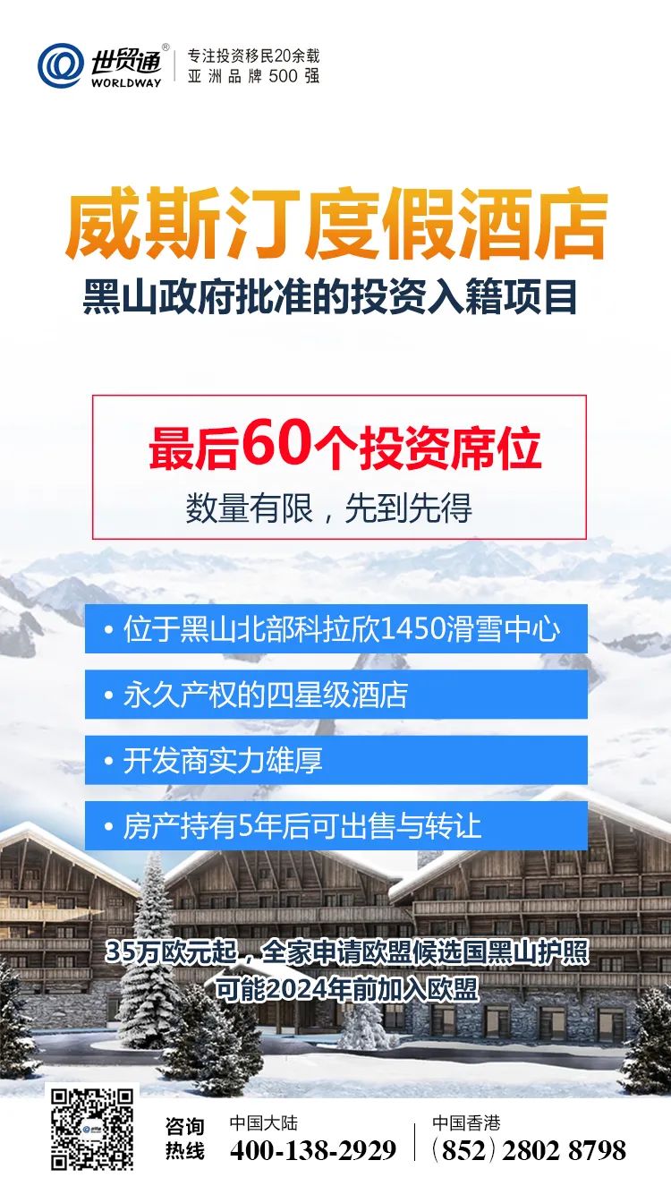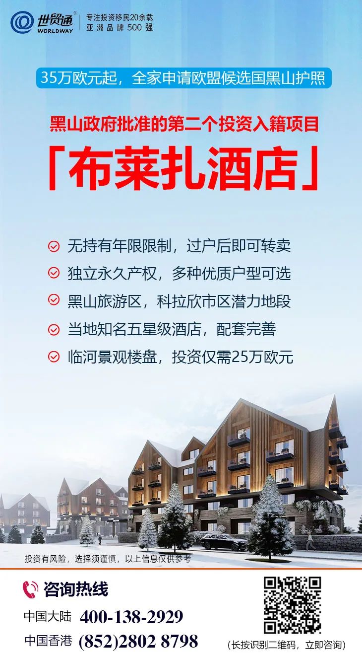 重大好消息!近日,世贸通集团向广大投资者隆重推介的——黑山政府新批准的投资入籍项目「巡洋舰酒店」,位于黑山南部海岸旅游胜地,紧邻亚得里亚海,环境优美,视野上佳。项目为独立永久产权的五星级酒店,无持有期限限制,过户后可自由转卖,全球限量252个名额,先到先得!投资者通过购买此酒店不仅能全家申请欧盟候选国黑山护照,还能实现海外房产和海外身份的双赢!