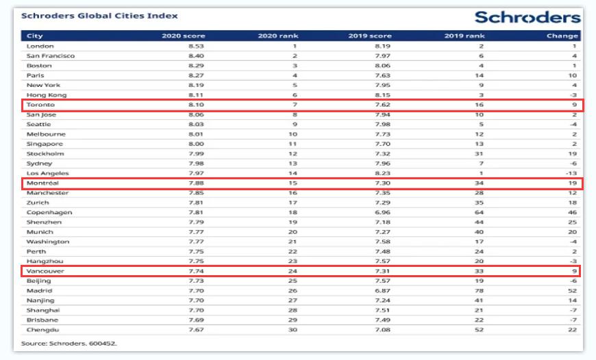 近日,全球资产管理公司Schroders发表了最新的《全球城市指数报告》,评选出了全球30个最佳城市。其中,加拿大有三个城市入围,分别是多伦多(第7名)、蒙特利尔(第15名)和温哥华(第24名)。
