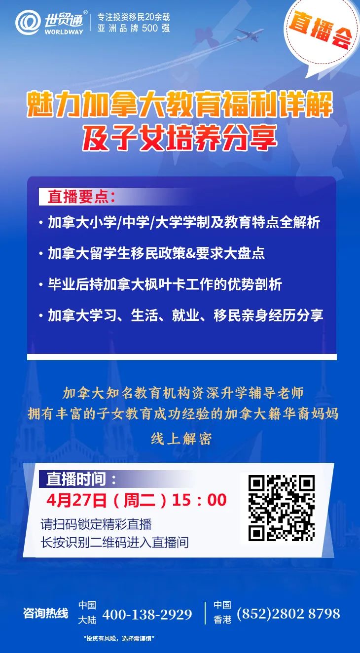 在这次的榜单中,有很多学校都表现突出,相信还将吸引不少学子前往加拿大深造。那么,加拿大教育到底有何独特魅力?为何备受热捧?移民后,可享受的当地教育福利都有哪些?加拿大教育成本高吗?毕业后持加拿大枫叶卡就业有何优势呢?一切疑问,请锁定4月27日(周二)15:00 “世贸通直播间”。
