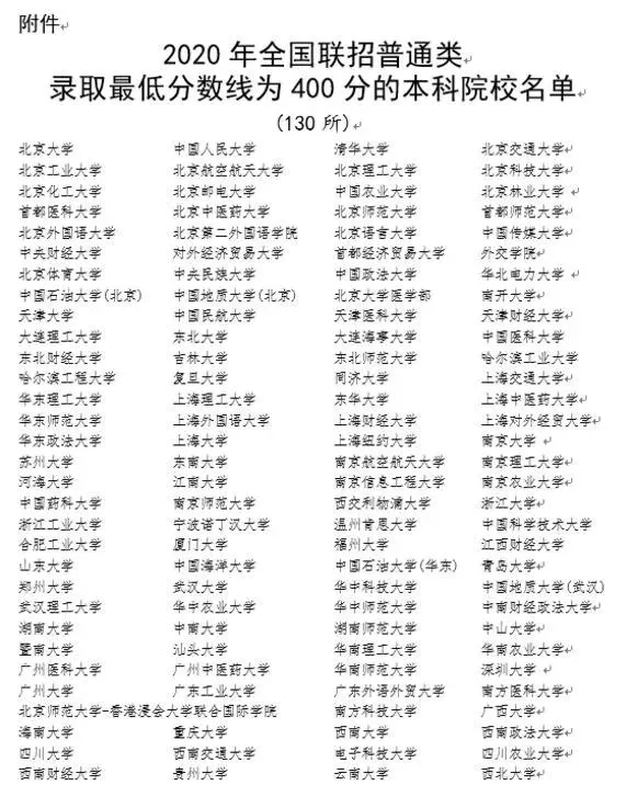 与今年高考报名人数1078万相比,华侨生联考的参考人数4484人竞争压力不值一提。华侨生联考虽然也要参加考试,但是考试难度却很低,录取分数线也很低,400分左右就能上国内名牌大学。在官方公布的2020年全国联招普通类录取最低分数线为400分的本科院校名单中,清华、北大等国内学生梦寐以求的一流大学均在其中。同样的大学,与普通高考考生相比,华侨生联考考生更容易低分被录取!