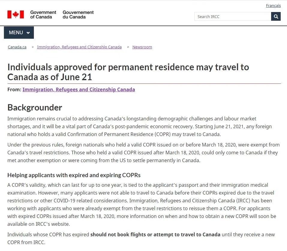 加拿大政府正式宣布:自6月21起,持有效的COPR(永久居民身份确认信,即PR登陆纸)的申请人可以入境加拿大完成登陆。