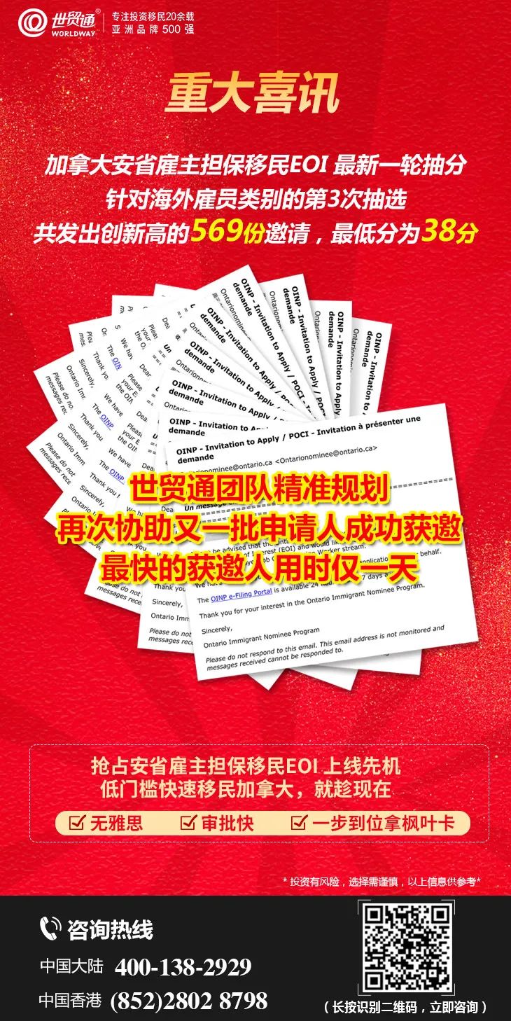 目前,安省雇主担保移民项目申请条件宽松,对语言没有任何要求,不需要考雅思。未来随着申请人数的增加,安省雇主担保移民项目筛选分数或将水涨船高。世贸通提醒各位投资人,移民规划要趁早,把握利好时机,尽快入池!抢占安省雇主担保移民EOI 上线先机,低门槛快速移民加拿大,就趁现在!