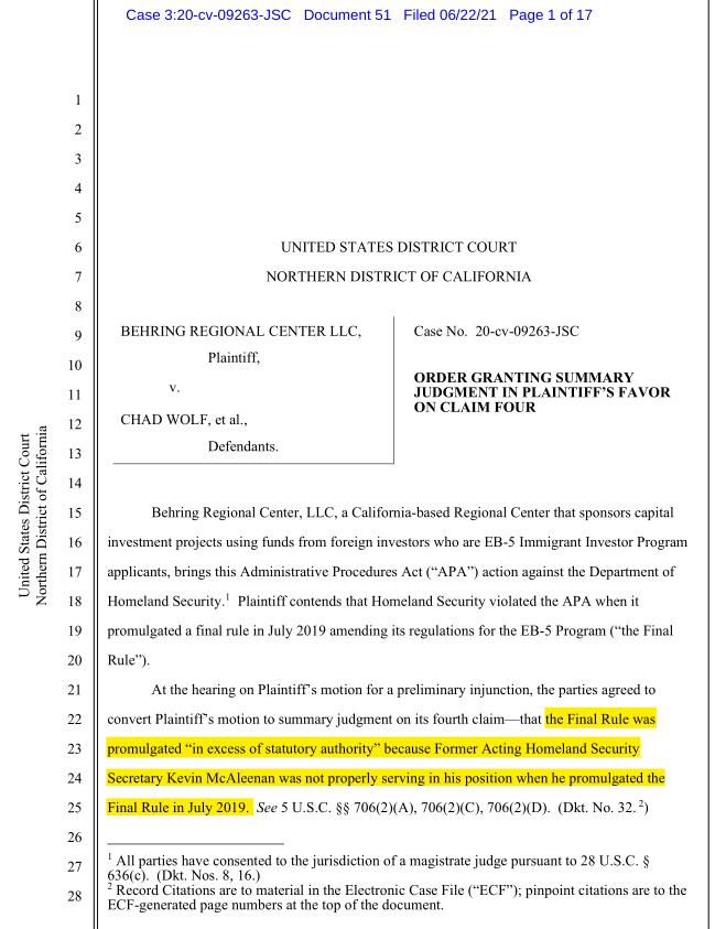 美国当地时间6月22日,加州北区地方法院对贝林区域中心(Behring Regional Center LLC)起诉前美国国土安全部代理部长Chad Wolf一案做出正式裁决:法院裁定时任国土安全部代理部长的任职不符合《联邦空缺改革法》的任职程序,撤销其2019年11月21日颁布的EB-5涨价法规(即投资额上涨至90万美元/180万美元)。裁决即刻生效!这意味着,EB-5涨价法规被暂时停止,恢复先前的投资额度,即TEA地区50万美元/非TEA地区100万美元。