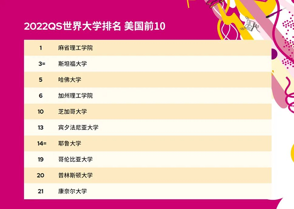 美国麻省理工学院连续第十年获得世界排名第一。斯坦福大学排名第3,哈佛大学排名第5,加州理工学院排名第6。