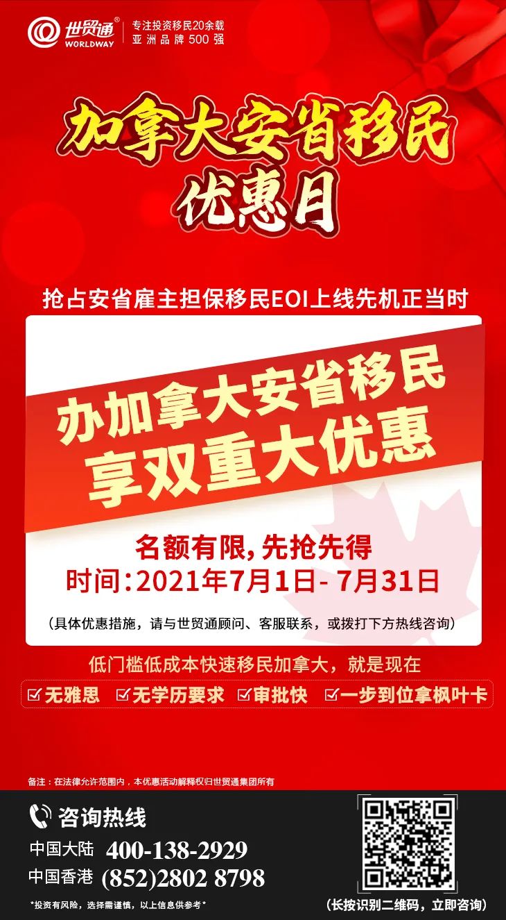 有意向把子女送到加拿大接受高质量教育的人士,可抓住当下加拿大百万移民计划的大好时机,10万加币起,低门槛低成本快速移民加拿大,全家一步到位拿枫叶卡,提前规划孩子的未来!目前,加拿大安省雇主担保移民项目申请条件宽松,对语言没有任何要求,不需要考雅思。投资人宜尽快行动,早申请早入池,早受益!