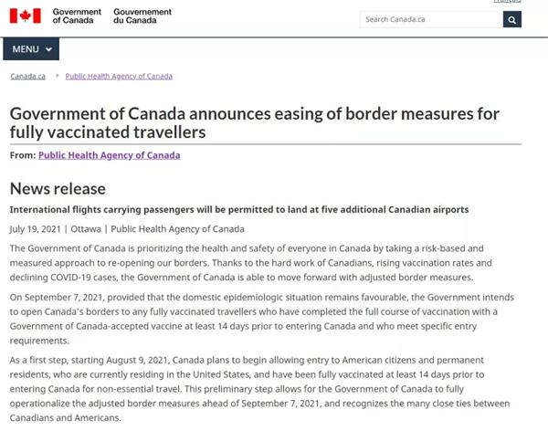 近日,加拿大联邦政府举行新闻发布会,宣布重开边境计划:从8月9日凌晨0点01分开始允许完全接种疫苗的美国公民和永久居民入境加拿大;计划从9月7日开始,允许其他所有国家的已经接种疫苗的旅客入境加拿大,且无需隔离。