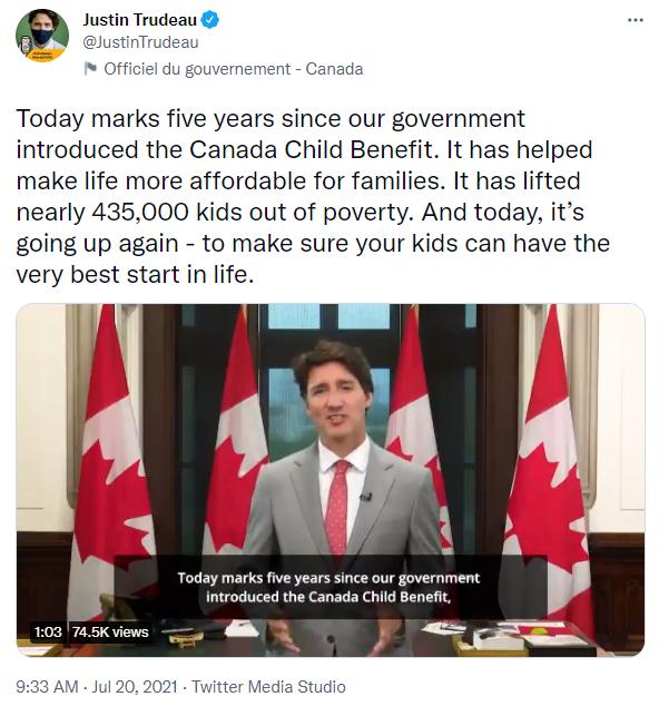 近日,杜鲁多在推特上宣布,加拿大再次增加牛奶金(Canada Child Benefit),以确保孩子们拥有一个最好开始的生活。