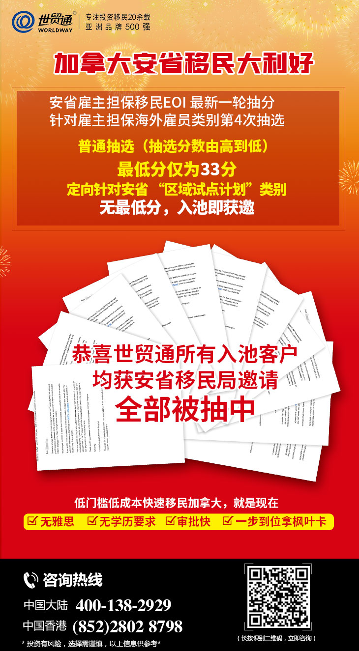 重大好消息!加拿大移民全线大回馈,即日起至2021年10月31日,办加拿大移民,送雅思礼包,名额有限,赠完即止。更多详情,请拨打世贸通服务热线,中国大陆:400-138-2929 中国香港:(852) 2802 8798。
