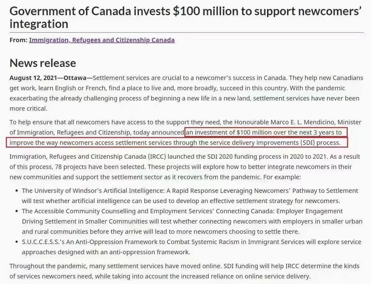 去年加拿大政府发布百万移民计划,2021-2023年计划接收123.3万新移民。加拿大政府已经意识到,在新移民首次抵达加拿大时为他们提供一些帮助,可以使他们更快地融入新环境。这是加拿大为新移民拨出1亿加元预算的良好初衷。可以说,这些服务为确保新移民在加拿大的成功发挥着重要作用。