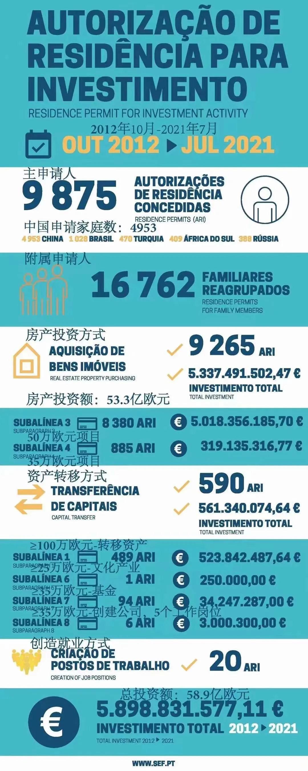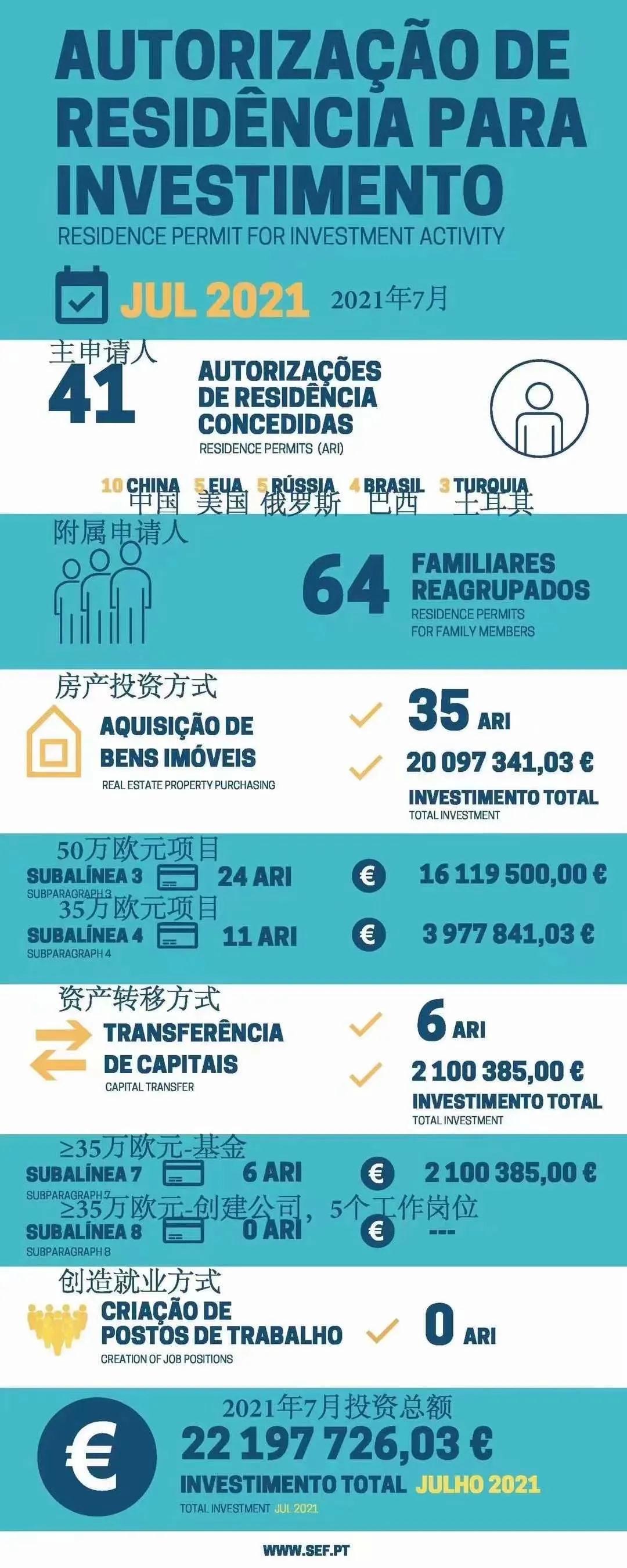 近日,葡萄牙移民局(SEF)公布了2021年7月份的黄金签证数据。2021年7月份,共计有41位主申请人和64位附属申请获批葡萄牙黄金签证,投资额为2219.7万欧元。其中,来自中国的申请人达到了10位,继续保持着优势。