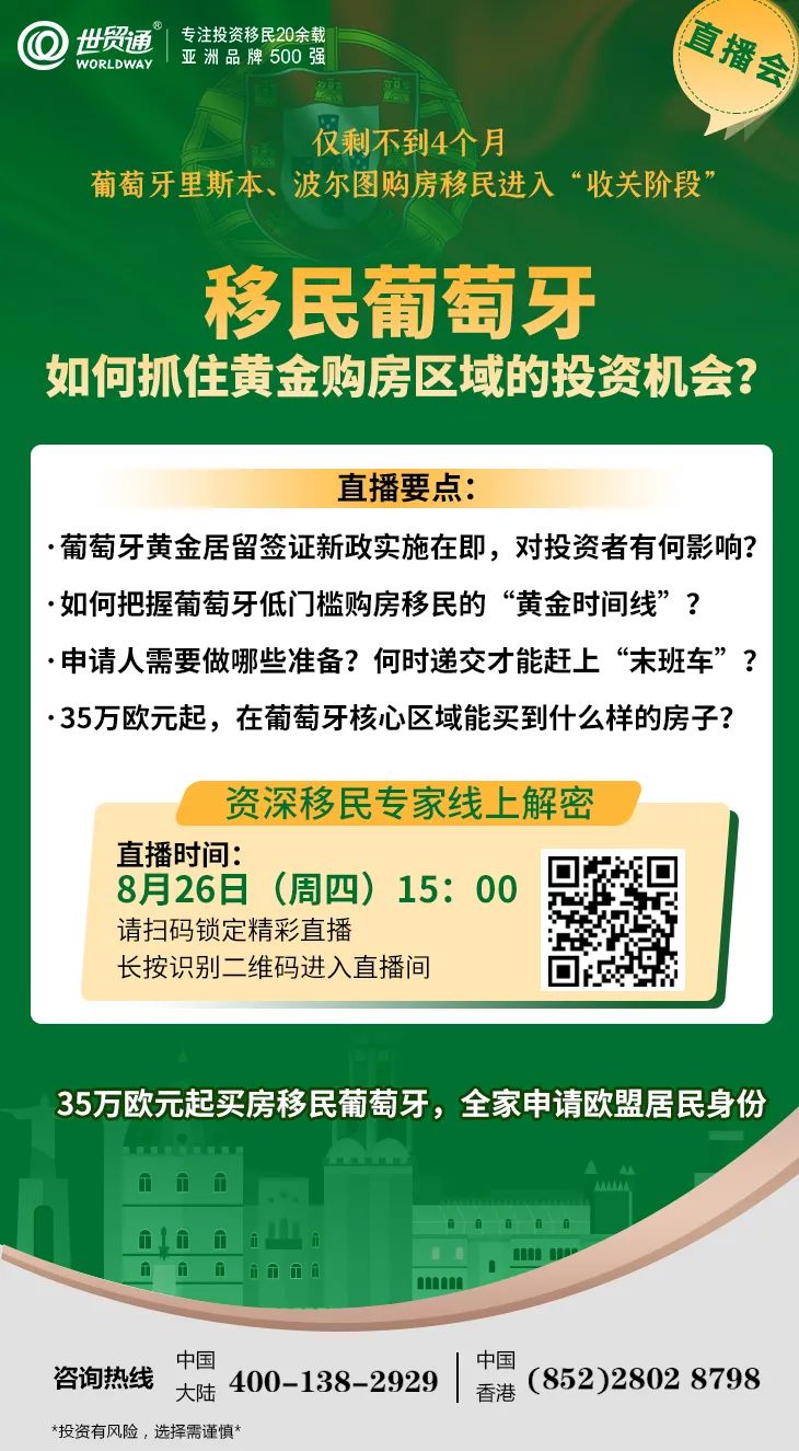 8月26日(周四)15:00,移民葡萄牙,如何抓住移民黄金购房区域的投资机会?