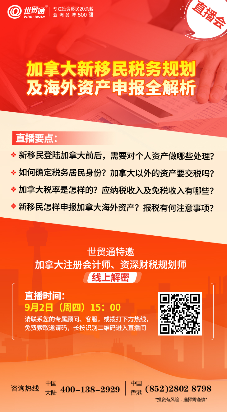 为了帮助加拿大新移民顺利赴往加国生活,世贸通特邀加拿大注册会计师、资深财税规划师亲临世贸通直播间,为您分享新移民必知的加拿大个人报税、海外资产申报等事项,请锁定“世贸通直播间”,别错过!